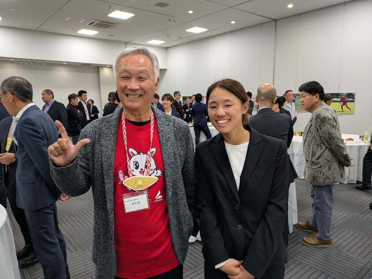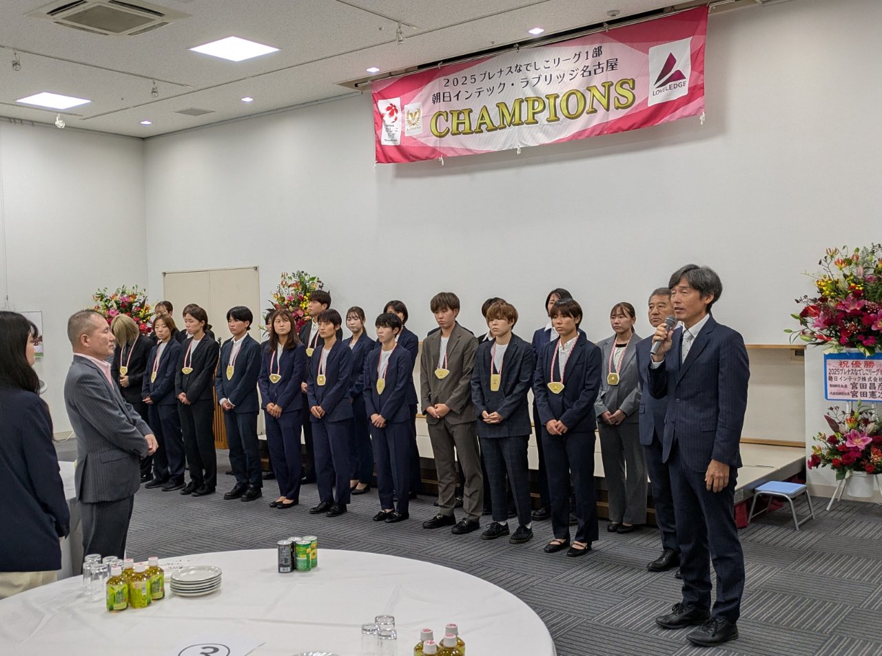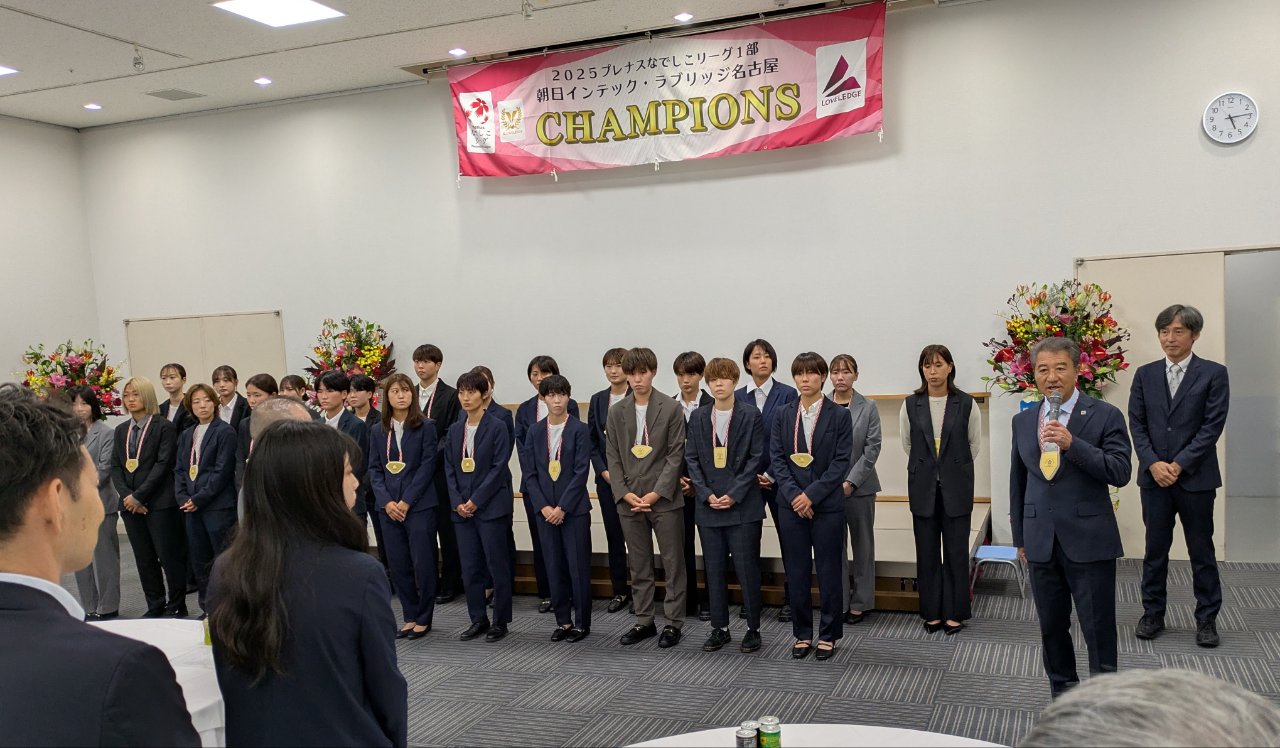 令和7年11月9日(日)瀬戸市の「瀬戸蔵」にて17:00~朝日インテック・ラブリッジ名古屋、なでしこリーグ1部優勝を祝う祝賀会に参加してきました。瀬戸市長の川本雅之様、朝日インテック株式会社の宮田憲次社長様はじめたくさんの方々がお祝いのご挨拶をされ、その後は選手との歓談で各テーブルごとに「おめでとう」の声が聞こえてきました。特に地元瀬戸市に於いてすでに地元から愛される存在になっているなと感じました。藤井聡太さんの次ぐらいかな…あ、瀬戸朝香さんもいましたね。あらためて優勝おめでとう!