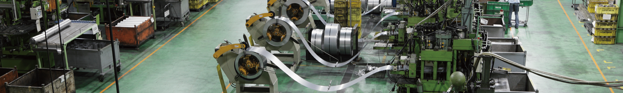 原材料のステンレス板を、必要な長さにカット。その材料を車種や部位に合わせてパイプ加工をするライン。巻き加工・曲げ加工・絞り加工を多用した金属プレス部品の製造は、河村工機製作所の得意分野です。